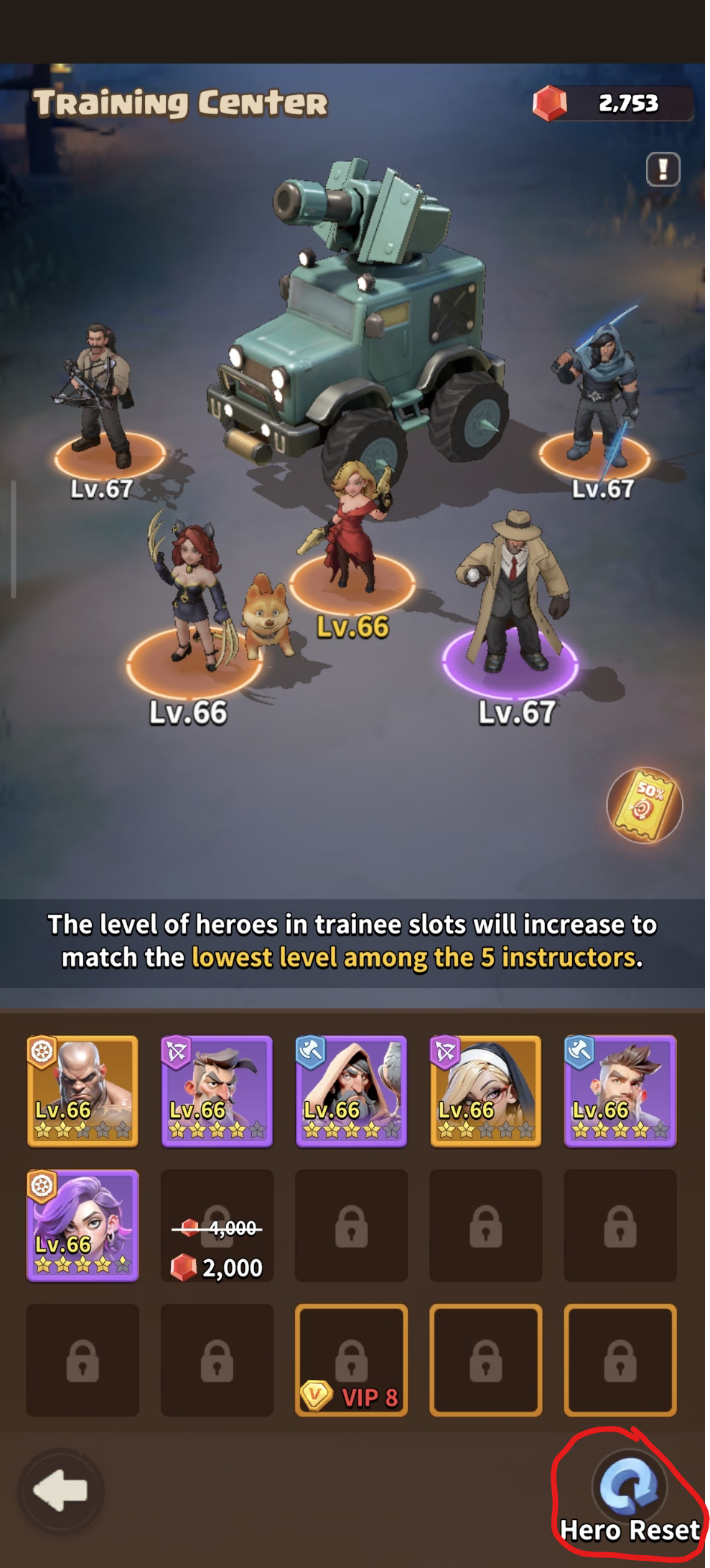 Remember to use Hero Reset before putting a hero in the training center. So you can get the most out of it. If I put my 42 level hero in training center, I would only gain lvl42-lvl66 differerence worth of benefit. Oppose to Lvl1-lvl66 difference worth.